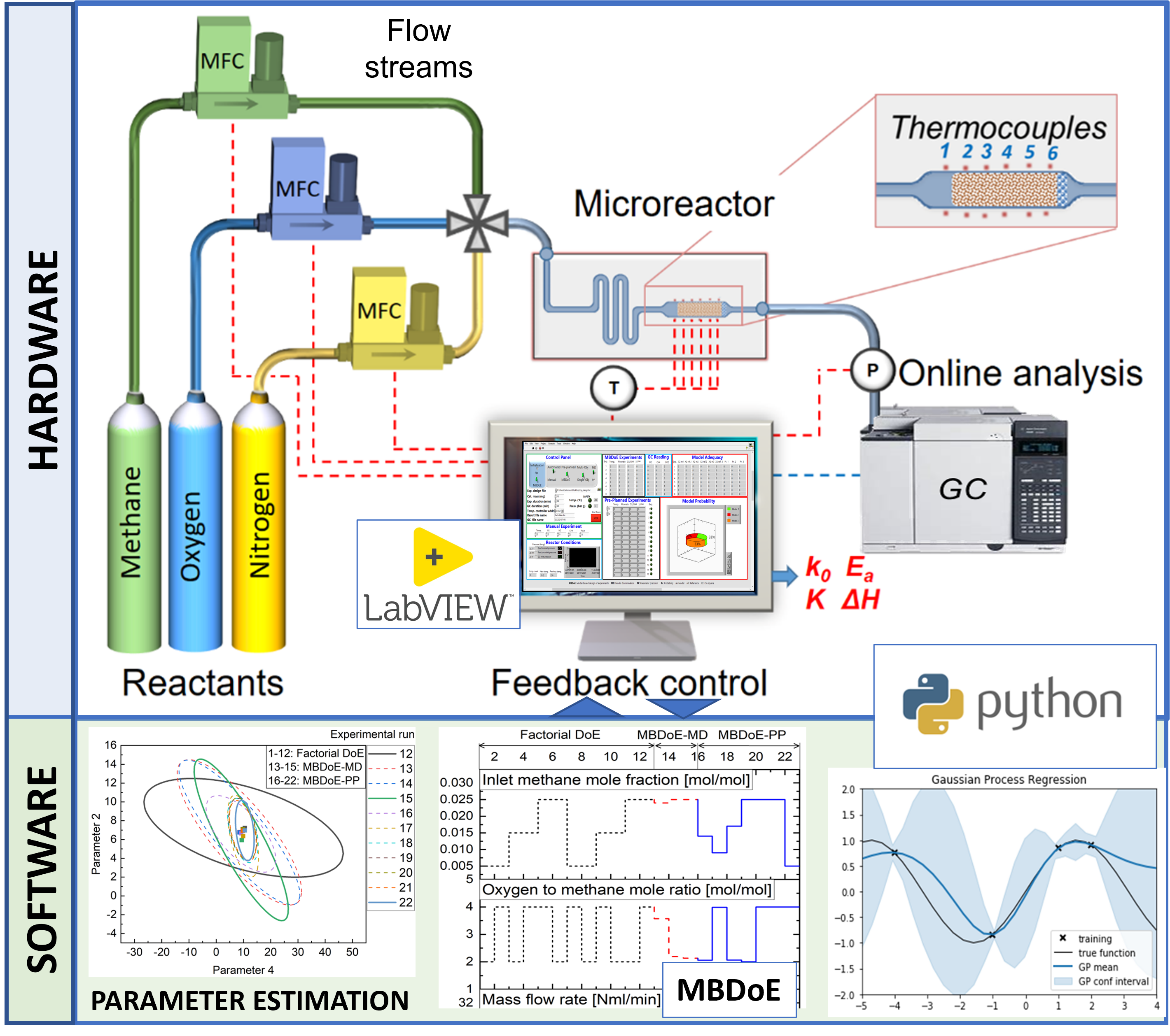 Smart laboratory platforms have been developed to drastically reduce the cost of experimentation for model development by integrating automated microreactor systems (hardware components), cloud-based computing, advanced model identification and optimisation algorithms (software components) to identify appropriate reaction models online. In these platforms, model-based design of experiments (MBDoE) methods are employed to i) discriminate among potential kinetic models; ii) estimate the set of model parameters precisely by designing optimal experiments that generate the data needed for rapid validation of kinetic models without human intervention. The computational framework of the platform was developed in Python programming language and was integrated into a LabVIEW program of the microreactor system. A new Pyomo-based parameter estimation module was employed in the framework for the efficient solution of online parameter estimation problems.